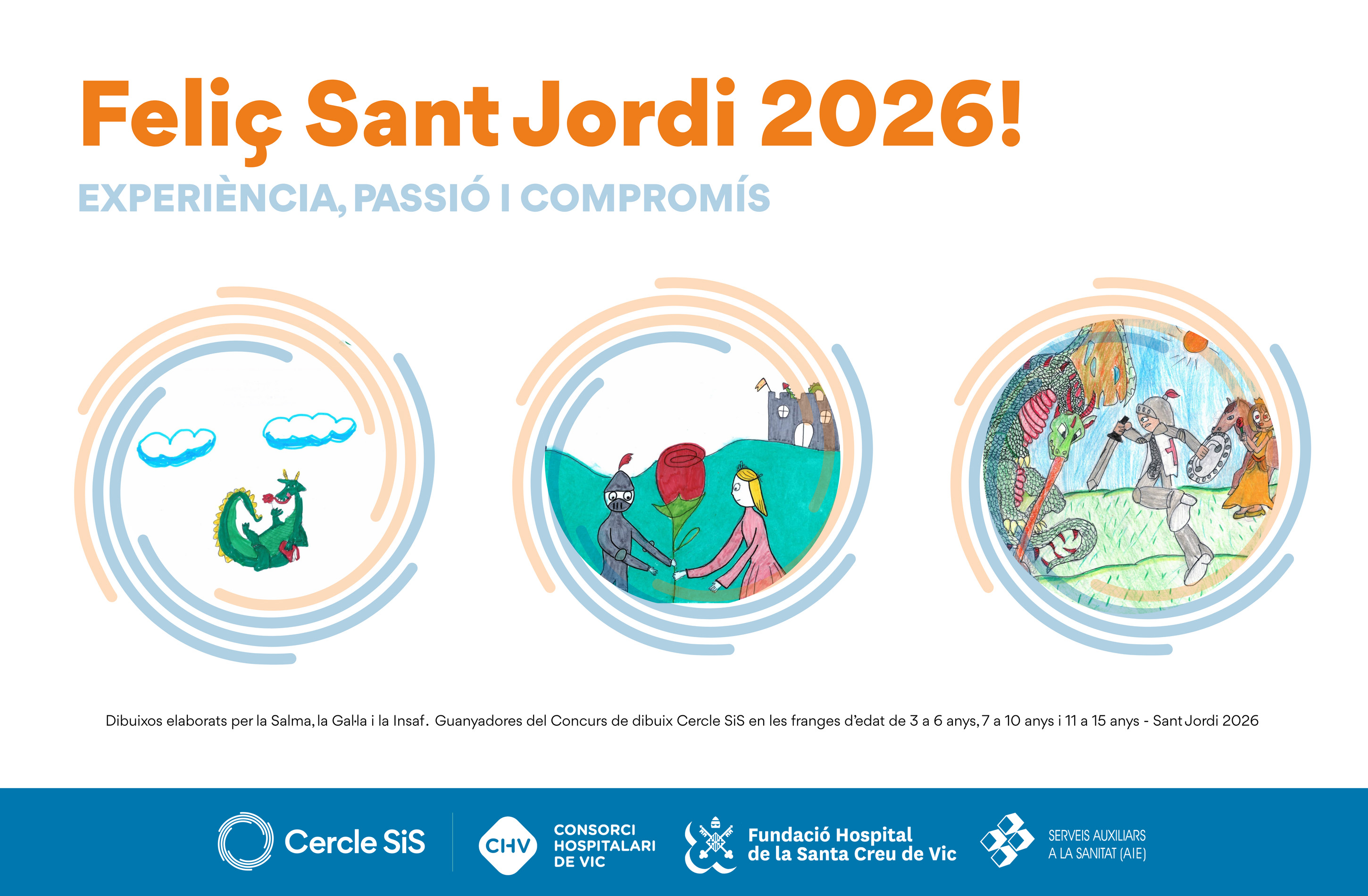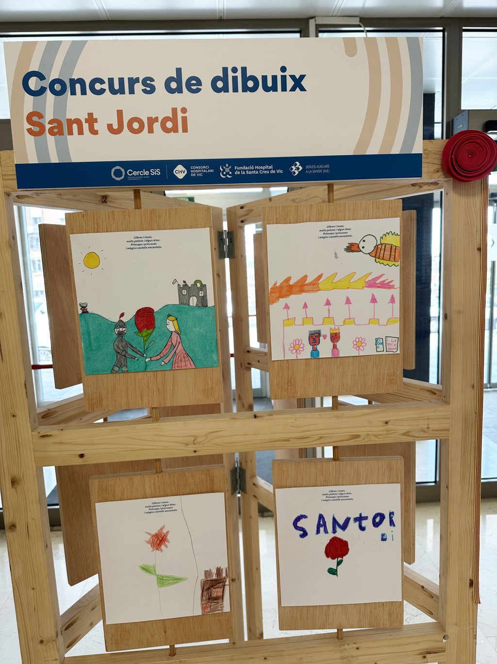 Aquest any hem rebut un centenar de dibuixos amb motiu del concurs 'Portem Sant Jordi a l'Hospital' organitzat pel Cercle SiS. Roses, llibres, dracs, cavallers i princeses omplen aquests dies el vestíbul de l'Hospital Universitari de Vic on podeu veure una mostra d'aquests dibuixos.